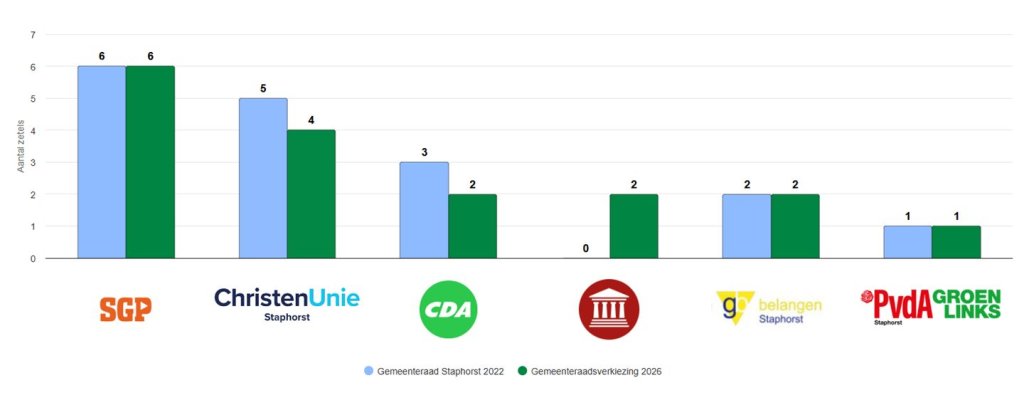 Het Centraal Stembureau van de gemeente Staphorst heeft op donderdag 26 maart de definitieve uitslag van de gemeenteraadsverkiezingen vastgesteld. In de gemeente Staphorst brachten in totaal 10.658 mensen hun stem uit. Daarmee is de opkomst 80,6 procent; in 2022 was dit 75,4 procent.