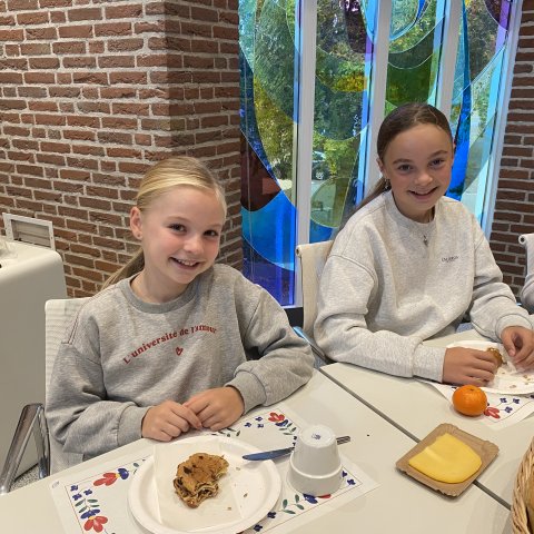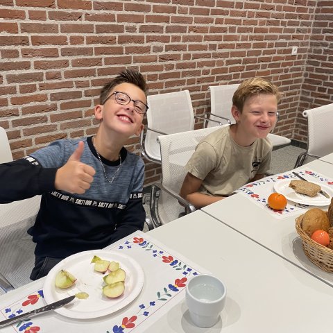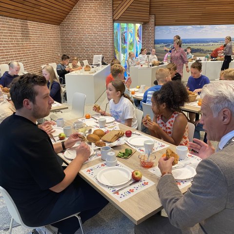 Kinderen ontbijten in de raadszaal